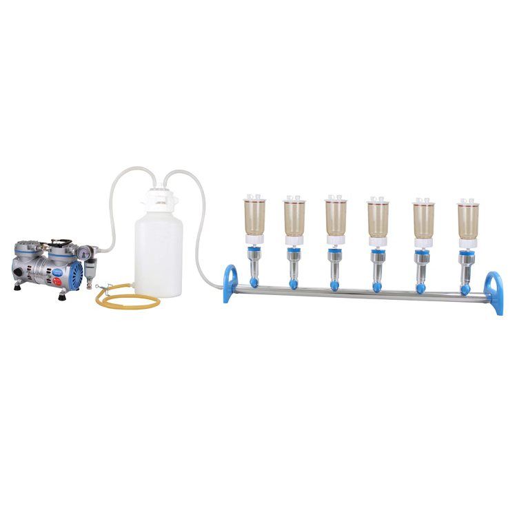 疾病控制、第三方检测等单位,由于检测样品数量多,如果每次只能过滤一组样品,效率低下。这时候就可以使用多联过滤系统,它是通过一组使用金属材质制作的过滤支架,将多组过滤杯连接起来,使其可以通过同一台真空泵来抽气产生负压吸力。典型的如BV-321-A三联式和BV-621A六联式微生物限度检测真空抽滤系统,可以同时过滤3组或6组样品。支架采用耐腐蚀的阳极铝合金材质制作,对应插入3或6支过滤漏斗,漏斗中间放置滤膜。支架侧边带有接口连接一个大容量的集液瓶,滤液通过滤膜后流入集液瓶内暂存,集液瓶底部带快速排液口,瓶满后松开排液管夹可以快速导出滤液,不需要停下工作打开集液瓶盖的繁复操作。集液瓶的顶部有2个接口,一个连接支架、另一个接抽滤泵,这样即可以实现1台泵搭配1只集液瓶,同时处理数个过滤漏斗内的样品,大幅提升过滤效率。